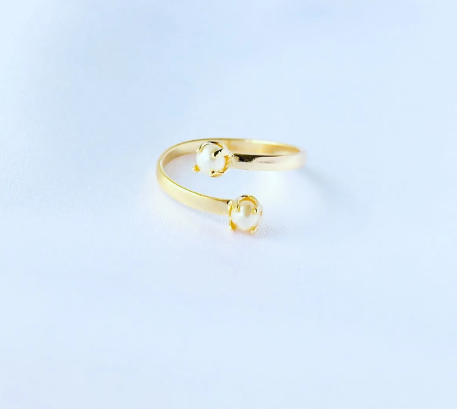 Anel Infantil Banhado a Ouro 18k de 10 milésimo com duas mini pérolas. Deixe a sua filha linda com nossas peças originais e divertida de anéis.