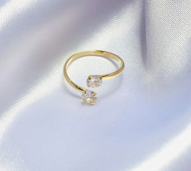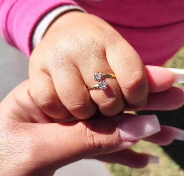 Anel Infantil Banhado a Ouro 18k de 10 milésimo com duas lindas pedras de Zircônia. Deixe a sua filha linda com nossas peças originais e divertida de anéis. São feitos com carinho e totalmente antialérgicos, ou seja, joias infantis hipoalérgicas e banhadas a ouro 18k sem níquel.