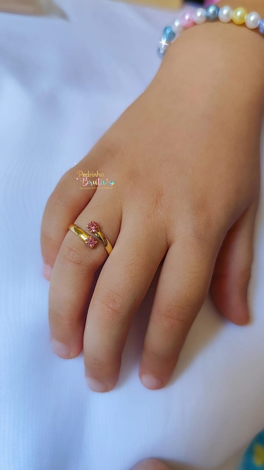 Anel Infantil Banhado a Ouro 18k de 10 milésimo com pedras de Zircônia na cor rosa. Deixe a sua filha linda com nossas peças originais e divertida de anéis. São feitos com carinho e totalmente antialérgicos, ou seja, joias infantis hipoalérgicas e banhadas a ouro 18k sem níquel.